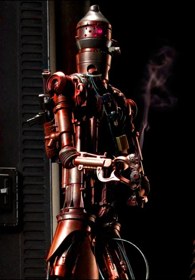 IG-90 was an IG-86 sentinel droid who worked as a bounty hunter during the Galactic Civil War.He worked with the bounty hunter Bossk, and was hired to join squad of bounty hunters hired by Doctor Aphra to preform an attack on an Imperial-class Star Destroyer to help Darth Vader in his research. The mission was completed when BT-1 destroyed the center of the ship. IG-90 and the rest of the bounty hunters left with more than half of their credits, or so they thought, as the rest of the credits were used by Vader and Aphra while hunting Luke Skywalker.